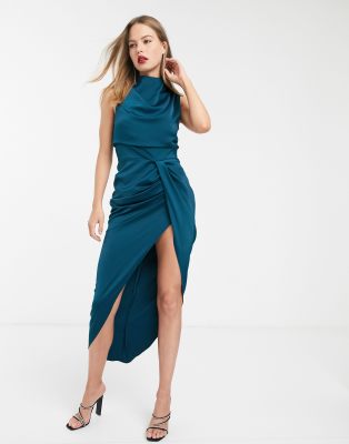 High Neck Dresses ASOS DESIGN high neck drape bias cut midi dress with cut out detail in textured satin.