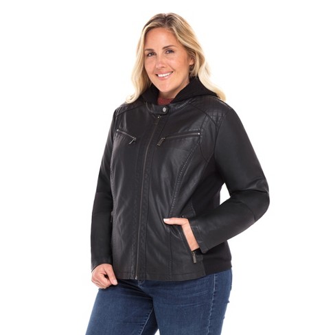 Sebby Collection Women's Plus Faux Leather Racing Jacket with Detachable Cable Knit Hood. Women Hooded Leather Jacket - Real Leather Womens