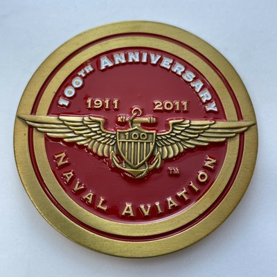 naval centennial 1911 usmc usn uscg aviation coin challenge The obverse features the official Naval Aviator Insignia with the 1911 to 2011 dates in high relief, with the words Celebrating a Century of Innovation wrapped across the top.The reverse illustrates the progress of the last century with one of the first Naval Aviator Pilots in period-style uniform with a 1911-era Hydroplane contrasted by a contemporary F/A 18 Hornet, with the aviator mantra of Fight to Fly, Fly to Fight, Fight to Win. If you were or are a member of the US Naval Aviation Program, carry this unique challenge coin, and display it with pride. forever.