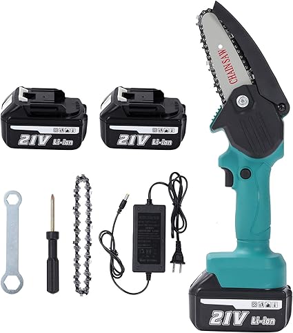 All accessories are included in the package: 1x Chain Saw, 2 x Batteries, 3 x Chain, 1 x Charger, 1 x Wrench, 1 x Instruction Manual; In addition, we have provide 1 x Noise Prevention Earplugs, 1 x Safety Goggles, 1 x Noise Prevention Earplugs for free. 2 Chains Included& Free Needle File Tool- The Rechargeable Mini Wood Cutting Lithium Chainsaw Has Two Chains For Replacement, Don't Worry Problem About The Replacement Of The Replacement Chain. Quick To Replace: Just Turn The Screw, Remove The Original Chain, Then Replace It With Ours, And Finally Tighten The Screw. 2.