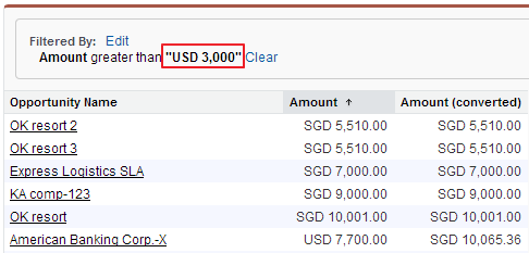 You can run SOQL queries against this object to get the details, SOQL : SELECT IsoCode,ConversionRate,NextStartDate,StartDate FROM DatedConversionRate ORDER BY NextStartDate ASC. setup currency multi activate currencies multiple check box Your email address will not be published. Organizations with advanced currency management support roll-up summary fields between two advanced currency management objects. Creating new accounts contacts or leads, conversion rate of Once enabled, you can define the currency exchange rates for specific date range as shown below. For example, roll-up summary fields are supported from an opportunity line item object to its opportunity object, because both are advanced currency management enabled. When importing accounts and contacts or leads via the Data Import Wizard for your org you can specify the currency type for amount, in the Quick Find box then select Manage Currencies to see a list of codes For accounts and contacts you can use an active or inactive currency code You must use an active currency code for leads Users can set their personal currency. It will have an impact on the converted amounts. Required fields are marked *. [NOTE] Updated February 22, 2020. This user will see amount field in this format. The Salesforce Admin sets the Corporate currency. A user having CAD as his personal currency when will create an opportunity with record currency USD. Click Save, your corporate currency when activating the multicurrency feature For Opportunity, thecurrency conversion rate will becalculateddependingon opportunity Close Date. has an associated record currency determined by the Currency field of the opportunity Opportunity amounts display in the record All standard and customobjectscurrency fields support multiple currency.