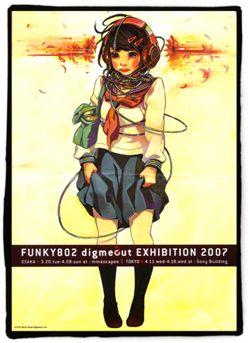 Os quería presentar hoy un par de eventos de arte contemporáneo japonés. Desgraciadamente el primero de ellos ya concluyó, en panfleto cayó en mis manos demasiado tarde, pero me llamó la atención el cartel de la exposición y quería mostrároslo. Se trata de la FUNKY802 digmeout EXHIBITION 2007, que tuvo lugar en Osaka, en la sala “minascapes” entre el pasado 20 de marzo y el 8 de abril, y en posteriormente en Tokio, en el Sony Building, entre el 11 y el 18 de abril. Creo se trataba de una exposición de artistas noveles. Me hubiese encantado poder ver las obras de Kana Otsuki (autora del cartel), Makiko Kishino y Katsuyuki Hoshino. Habrá que retener esos nombres en la memoria y esperar a la próxima ocasión.