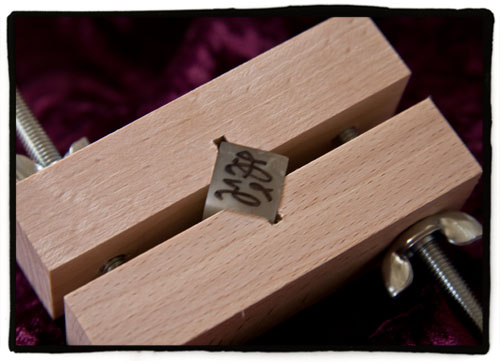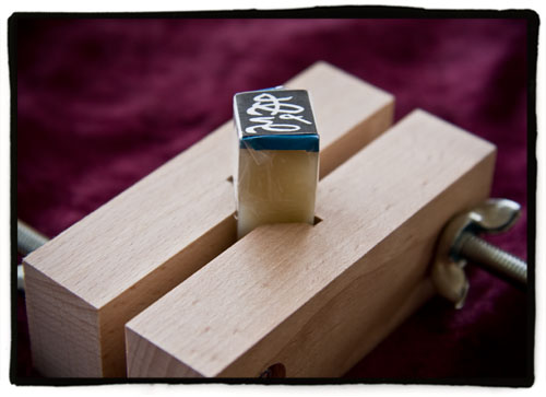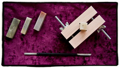 A la izquierda tenemos tres piedras diferentes. Su precio es muy variado, pero puedo deciros que ninguna de las que aparecen en la imagen supera los 300 yenes. Su aspecto es parecido al del mármol y de hecho juraríÂa que de ese tipo de caliza de trata. Lo que veis a la derecha es una especie de gato hecho con dos tacos de madera (en el centro se les ha practicado un corte en ángulo) que están unidos por medio de dos tornillos con sus palometas para agarrar bien la piedra. No recuerdo el precio de este utensilio, pero no creo que superase los 500 yenes. Finalmente debajo tenemos un estilete de doble punta con el que realizaremos la talla.