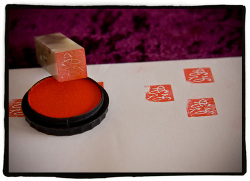 La siguiente fase es la más delicada, aqué necesitaremos un poquito de pulso y buen control de la mano, pues a la míÂnima que nos descuidemos se nos va el estilete y nos cargamos el motivo. Mi consejo es tallar con suavidad y lentitud, cavando el surco en varias pasadas. De vez en cuando necesitaremos hacer pruebas sobre papel con un tampón (el que veis en la foto es de una de esas tiendas de todo a 100 yenes):