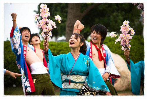 El yosakoi (su nombre, tomado de un japonés algo lejano en el tiempo, significa “ven por la noche”) es un baile originario de la prefectura de Kouchi, en Shikoku. Comenzó a rodar tras la Segunda Guerra Mundial, allá por 1954. En sus principios venía a ser una versión moderna del Awa Odori, la danza tradicional de Tokushima, pero en la actualidad se ha convertido en un estilo muchísimo más enérgico que combina diversos bailes dentro de complicadísimas coreografías que son puestas en escena por grandes grupos.