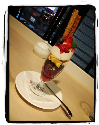El menú es bastante completito pero mi recomendación es el “パフェ” (parfet). Hay varios tipos pero las dos veces que he estado en Fouquet´s he tomado el de “berry” (cranberry, blueberry, strawberry). Frutas, helado de vainilla, galletas, tarta de queso, cereales de chocolate y helado de cassis (カシス, en japonés, grosella negra en castellano). El precio de la copa ronda los 1200 yenes, pero merece la pena. 😀