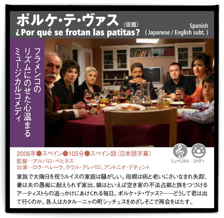 El próximo fin de semana tendrá lugar en Osaka el 14th Osaka European Film Festival. En esta ocasión será presentada una pelíÂcula española dirigida por ílvaro Begines, el que fuera guitarrista del grupo sevillano “No me pises que llevo chanclas”. El film lleva por tíÂtulo “¿Por qué se frotan las patitas?”, aunque en Japón se llamará “¿Por qué te vas?” (escrito en katakana “ポルケ テ ヴァス”).