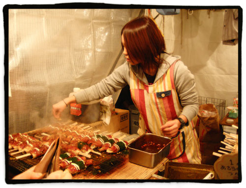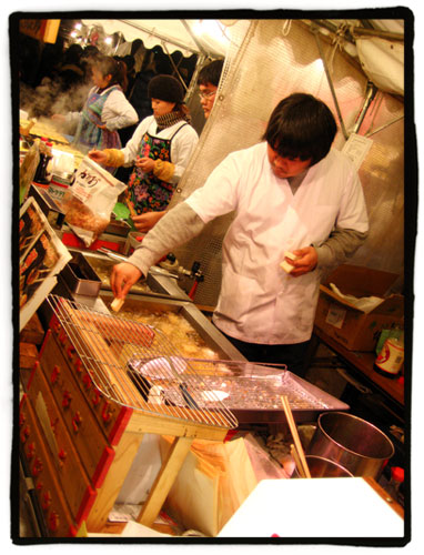 Una vez bajamos nos armamos de valor para meternos en el embudo de personas que minutos antes habíamos divisado desde arriba. Y no nos arrepentimos, para nada. El lugar estaba lleno de puestos de comida y dulces, de modo que decidimos unirnos al festín como partícipes. Empezamos a estudiar las ofertas gastronómicas del lugar, desde el takoyaki…: