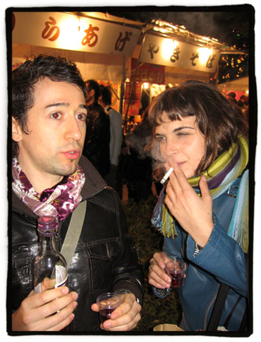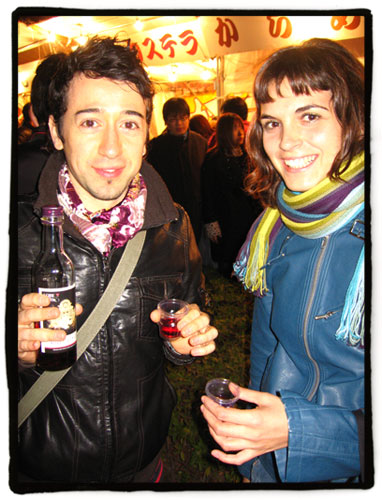 Y… falta algo, ¿no?, claro, hombre, ¿qué fiesta es una que no esté amenizada con un vinito? Compramos una botellita de vino de Kobe que vendían como omiyage, pero nos la tomamos al estilo Feria de Abril, como si fuera manzanilla, con vasitos de plástico mientras caminábamos.