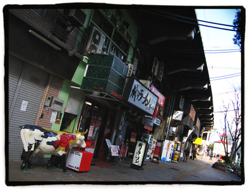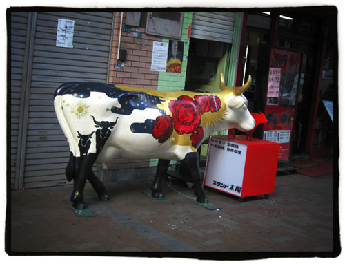 Se trata de un restaurante que está a pocos pasos de la estación de Motomachi JR. La especialidad es la ternera, que es el producto estrella de Kobe. Dos cosas son las que me llevaron a sacar estas dos fotos: la primera salta a la vista, ¿no?, me refiero a la vaca, seguramente procedente de algún “Cow Parade”. El segundo motivo es el nombre del local, スタンド 太陽, algo así como “Tribuna sol”. Todo ello muy taurino, deshou?!