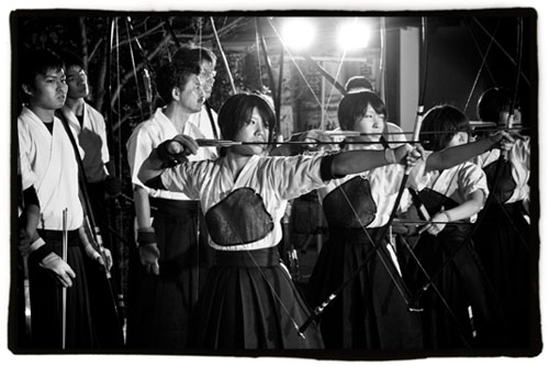 Miembros del club de “kyuudou” (弓道) preparándose para tirar.