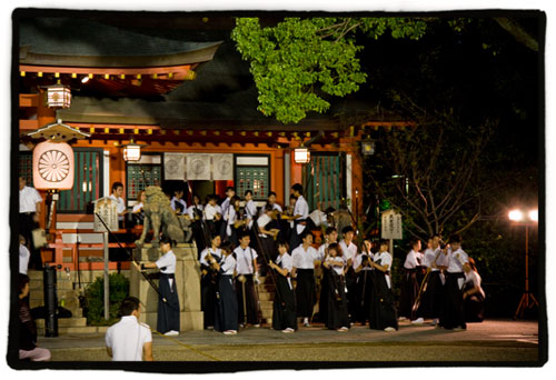 Salí al encuentro de Ana, que había vuelto de España un día antes. “Nos vemos en Ikuta Jinja en cinco minutos, estaré por allí haciendo unas compras” me dijo cuando hablamos por teléfono y comentó algo acerca de una exhibición de artes marciales que estaba teniendo lugar en el santuario. Yo ya estaba pedaleando entonces y, aunque era un poco tarde y había poquita luz, había salido de casa con la cámara –“nunca se sabe lo que uno se va a encontrar por ahí”, pensé–.