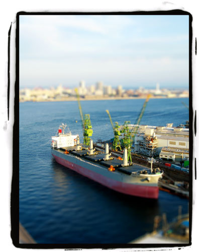 La zona de Harborland en la que podemos encontrar el mercadillo está detrás del Mosaic, al sur, frente a la fábrica de Kawasaki, donde reparan barcos como el grandote que vemos al fondo en esta imagen: