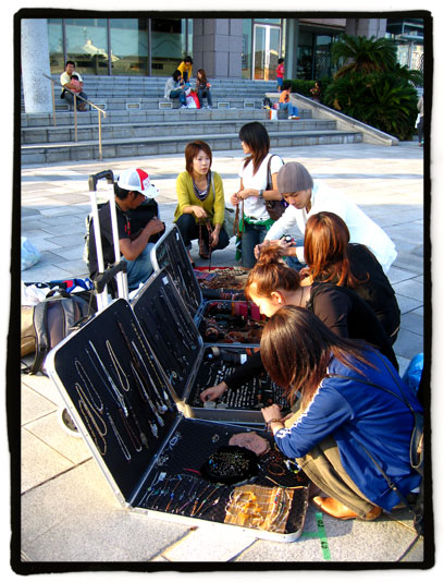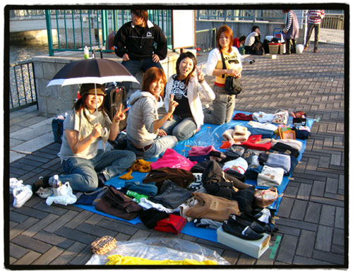 La mayoría de los puestos eran de chicas que vendían o trataban de vender toda esa ropa que les sobra de sus percheros. Este grupito de amigas aprovechaba la mañana allí para sacar algunos yenes mientras charlaban de sus cosas, seguramente planeaban donde gastarían esos dinerillos obtenidos: