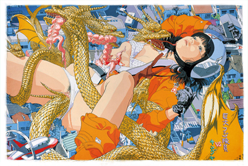 Como mucha gente señala existe una cercana similitud entre el Ukiyo-e, un género pictórico de la era medieval japonesa, y el manga o el anime que hoy en día son tan populares. Ambos están estrechamente conectados a los, con frecuencia, indecentes gustos de la gente y por lo tanto no pueden ser reconocidos como arte, aun siendo las más originales y honestas formas de expresión visual para los japoneses. Desde mis tiempos de estudiante ha sido para mi una asignatura pendiente crear un estilo pictórico que haga de puente entre los dos géneros de un modo evidente. Creo que este acrílico, basado en “Kinoe no Komatsu” (un conocidísimo grabado pornográfico de Hokusai Hatsushika que representa a una mujer buzo haciendo el amor con un pulpo), puede ser una solución sustancial, puesto que la obra de Hokusai armoniza con los monstruos de las series de las películas de “Godzilla” y con los personajes de la serie de televisión “Ultraman”, temas bases de la denominada cultura otaku.Makoto Aida, Monument for Nothing.