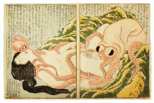 Dejo a continuación un par de enlaces curiosos. En el primero tenemos una interesante traducción del diálogo escrito tras el dibujo de la mujer buzo y los pulpos de Hokusai. En el segundo podemos ver un diorama de la misma obra.