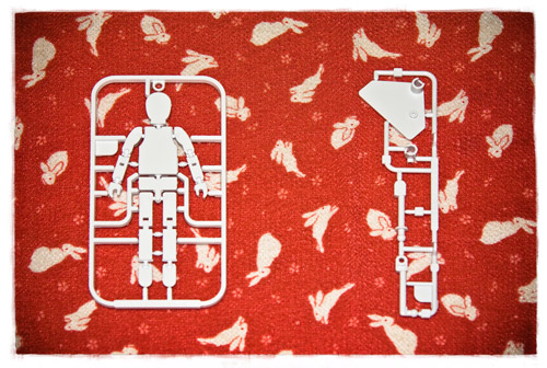 La cajita que recibimos contiene un kit de plástico con las piezas móviles de un muñeco y una pequeña peana para mantener la diminuta estructura en pie.