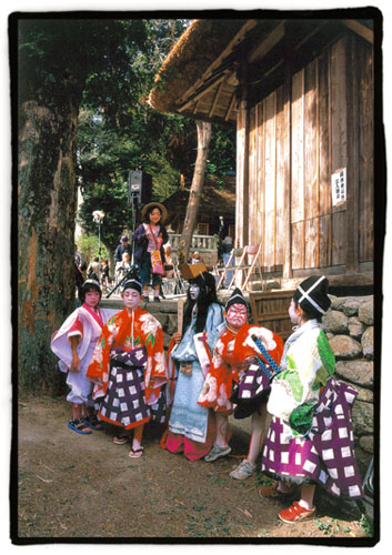 Esta imagen fue tomada en Kitaku. Son niños que celebran una festividad que recuerda los tiempos en los que los campesinos tenían prohibido asistir al Kabuki, por lo que ellos mismos representaban obras que lo emulaban: