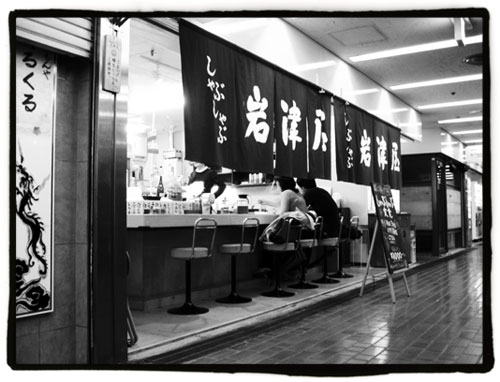 En los bajos de la galería comercial de Sannomiya son muchísimos los lugares entre los que podemos optar para un buen almuerzo o una temprana cena. El de la foto es un pequeño establecimiento famoso por su Shabushabu, un tipo de carne (suele ser de ternera aunque también se sirve carne de cerdo) que está cortada en tiras finísimas y que se cuece con agua hervida. Este lugar en concreto se llama “岩津屋” (Iwazuya):