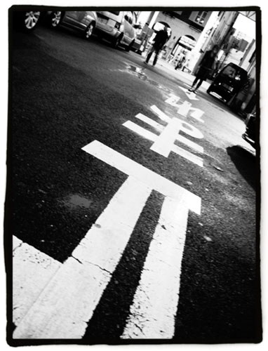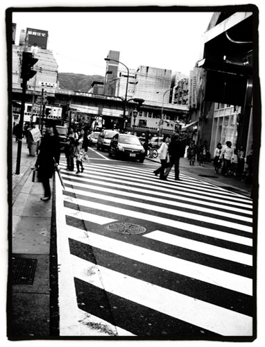 Más cerca de Sannomiya, en Tor Road, está este paso de peatones. Es habitual encontrar pasos de cebra con las líneas en diagonal por Japón: