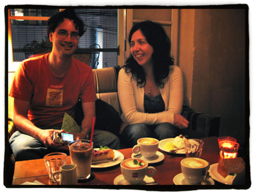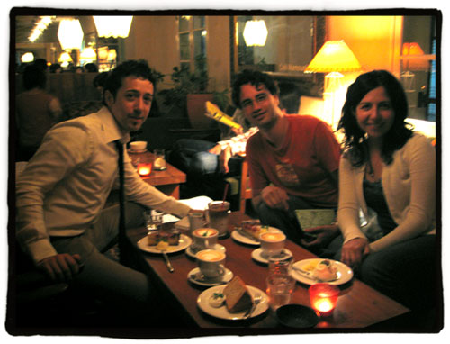 Aquí pongo un par de fotos de ayer, aunque como estábamos en una cafetería de las que abren hasta bien tarde la luz era bastante tenue. Por cierto, el lugar es el “Cafe Mamounia”.