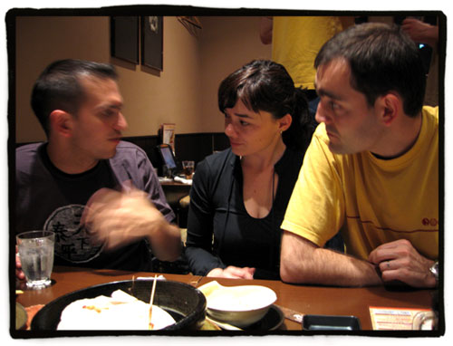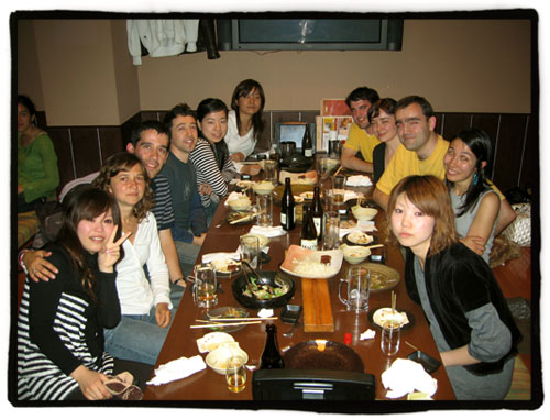 De izquierda a derecha estaban Eri (la amiga kawaii de Flapy, con la que nos reímos muchísimo), Susana, íscar (estudiante Vulcanus afincado en Tokyo), yo mismo, Yito, Kanako (ex-estudiante de Osaka Gaidai que se ha echado un novio de Granada, ¡casi ná!, y que llegó a preocuparnos cuando nos preguntó por el famoso plato tradicional en Andalucía: las migas con melocotón…, al final resultó que era melón, jeje), Javi (que está estudiando en Yokohama, muy buena gente), Arantxa y Antonio (un joven matrimonio que está viviendo en Tokio, él estudiando en la… Todai!!, y ella estudiando japonés y blogueando, súper simpáticos los dos; imagino que Antonio estará deseando poner en práctica el Kansai-ben que se llevó anotado en su librito multiusos), Ana, y Do-chan, otra de las amigas de Flapy, que no sé de dónde saca tantas amigas, voy a tener que hablar seriamente con su supervisor en Nara porque este chico no se me está aplicando en lo que se me tiene que aplicar.
