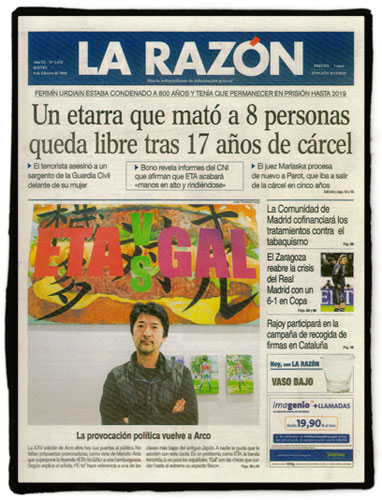 En la imagen vemos la portada del diario “La Razón” del día 9 de febrero de 2006. El titular también habla de ETA. La foto de la primera página nos muestra al artista japonés ante su obra. El texto no se puede ver bien en la imagen, de modo que lo reproduzco aquí: