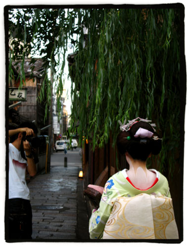 Una vez que salimos de aquella zona pasamos por Gion y allí, en una de sus callejuelas, junto a un canal flanqueado por sauces, volvimos a encontrarnos con la misma mujer y su comitiva. Allí pues aprovechamos para tomar nosotros también algunas fotos.