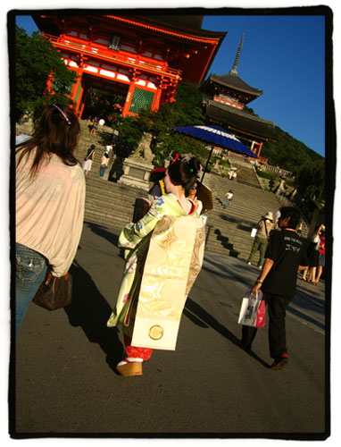 Ya por la tarde andábamos por los alrededores de Kiyomizudera cuando nos cruzamos con un grupo de fotógrafos que seguían a una señora ataviada con un kimono a lo geiko y con un peinado al estilo “ofuku”. En esto último igual me equivoco porque no es que yo tenga precisamente experiencia en eso de distinguir los diferentes peinados. El caso es que de estar en lo cierto lo de “ataviada” cobraría un mayor grado, primero porque la mujer en cuestión no es una auténtica geiko sino una señora que un buen día decide pasar por un estudio del barrio de Gion donde la visten, la maquillan y la peinan para luego darse un garbeo por allí, y en segundo lugar porque el peinado “ofuku” se supone que está reservado a las maiko que acaban de cumplir dieciocho años o a las que llevan tres años de aprendizaje. En fin, de todos modos la pista más clara para pensar que se trataba de una “falsa” geiko era la serigrafía que mostraba la camiseta de uno de los fotógrafos, el que seguramente estaba pagado por la señora en cuestión para la realización de un álbum personal. La camiseta tenía la publicidad de un estudio fotográfico de Kyoto. En cuanto al resto de fotógrafos no estoy seguro pero me consta que existe un servicio en este tipo de establecimientos que por unos pocos billetes de mil te ponen a una modelo con “disfraz de serie en un marco incomparable” para llenar varias tarjetas de memoria con cientos de “jotapegés”. He visto ya a varias chicas posando de ese modo por el puerto de Kobe y hay muchos anuncios en las revistas especializadas, algunos de ellos para fotografiar incluso desnudos.