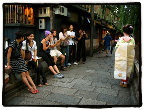 El hecho de que sea o no auténtica lo veo como algo anecdótico. De hecho imagino que ha de ser uno muy entendido para distinguir las sutiles diferencias en algunos casos. No creo que alguien ajeno a ese mundo pueda llegar a disfrutar plenamente de una reunión con auténticas maiko o geiko, por ello me resulta de lo más esnob ver a esos “guiris” que llegan al lugar en un coche con cristales ahumados y salen de él, con sus gafas de sol puestas (ya sabemos todos la claridad cegadora del interior de un coche con los cristales opacos) sin pausa cuando el chófer les abre la puerta, como si con esas prisas quisieran mostrar a los presentes que “están en el taco”. Me consta que se dejan una buena pasta en esos garitos para después poderlo contar a sus colegas en el club de golf, en fin, con su pan se lo coman. Es algo que no me invento, estos ojitos lo han visto.