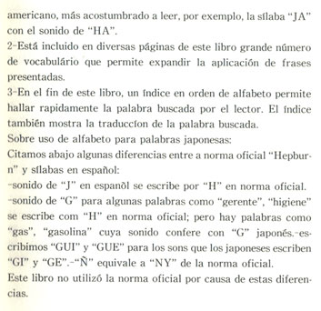 Bien, entiendo que el libro nace de la buena aceptación de la guía de conversación japonés-portugués, pero no creo que ese hecho justifique en ningún momento la dejadez de los editores. No creo que sea difícil encontrar nativos hispanoparlantes viviendo en Japón que estén dispuestos a revisar un textito. Y aclaro que no estoy hablando ya de traducir sino de revisar, de corregir errores como los de arriba.