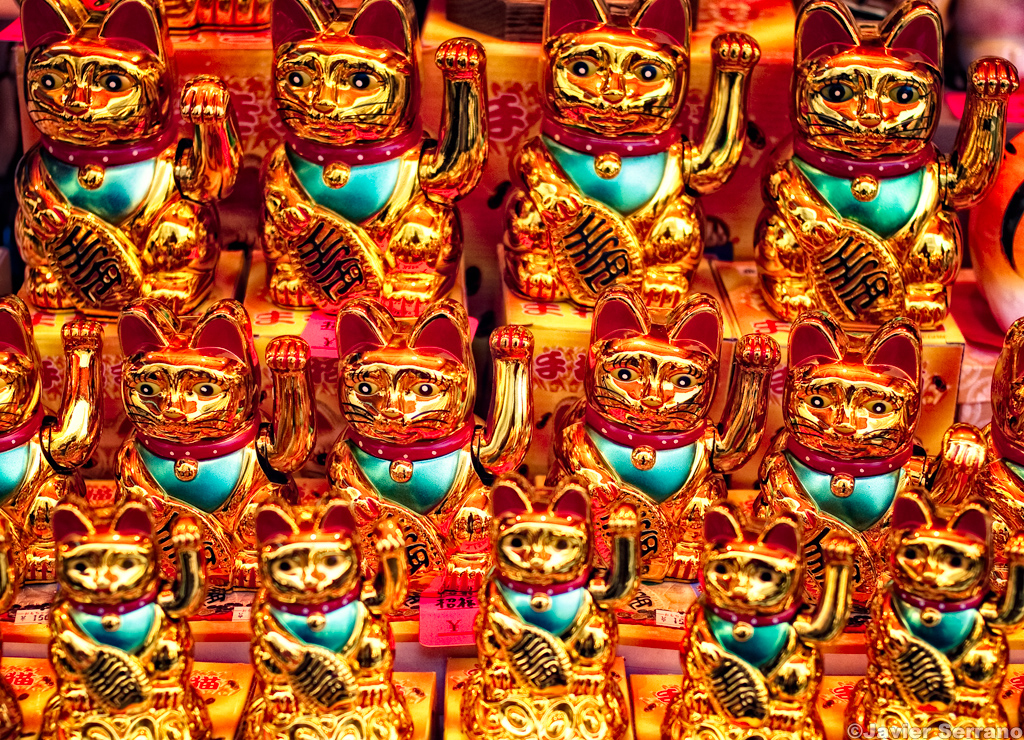 Manneki-neko figures in a stall during the Ebisu Matsuri, Hyogo (Kobe).