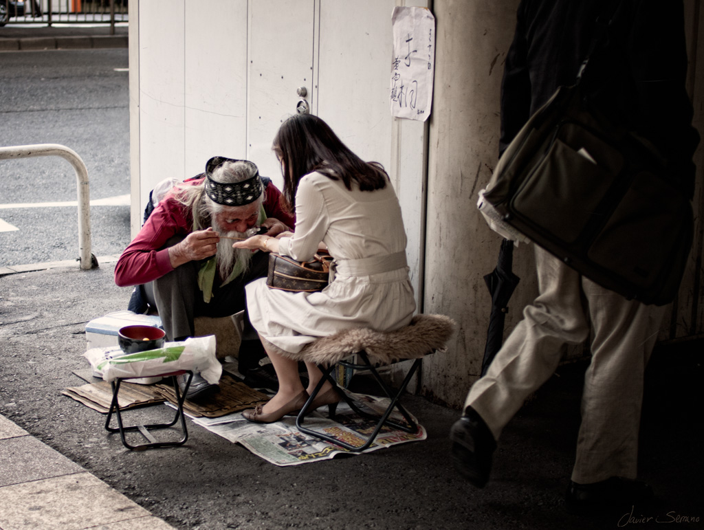 I’ve seen many handreaders but none like him (especially the magnifying glass), looking at his long white beard that he has many years of hand reading wisdom for this young lady. Luv the timing of this image he looks very focused and maybe she’s looking for a husband. «GREAT SHOT»